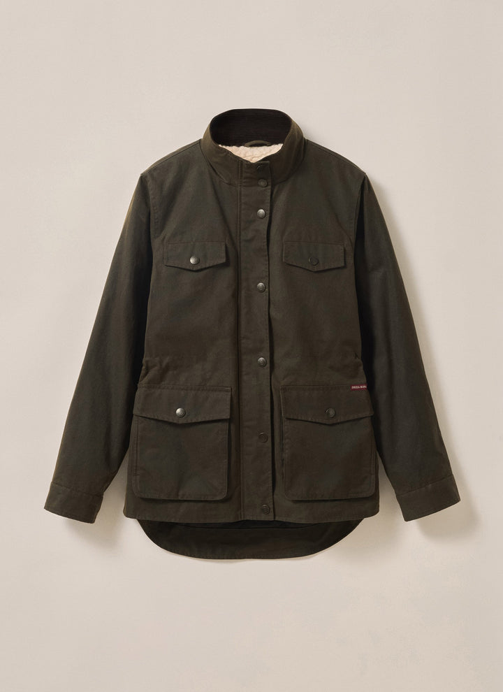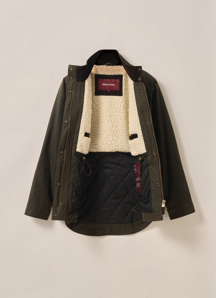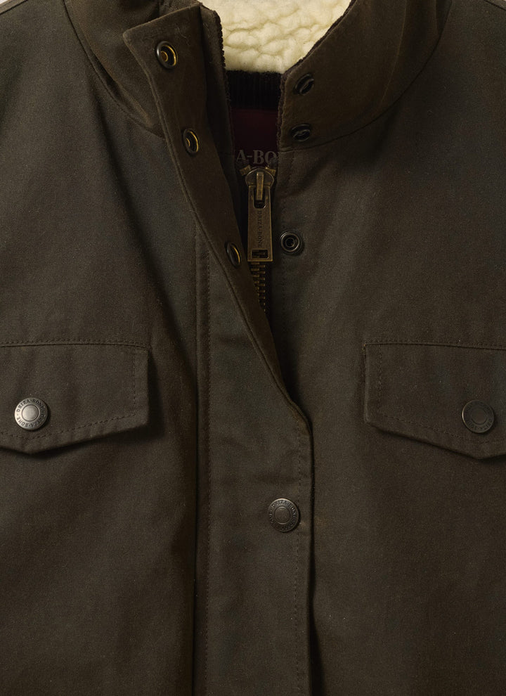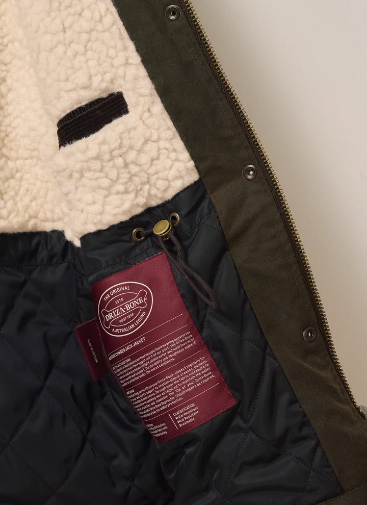 Lined with 100% wool shearling, the Lumberjack Jacket is made from our heavy weight wind and water resistant oilskin. Featuring a quilted lower body and sleeve for extra warmth, adjustable sleeve cuffs and a heavy duty two way zip with studded flap closure.