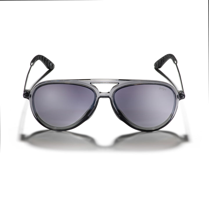 Modern aviator shaped frame with adjustable temple arms and enhanced grip features.