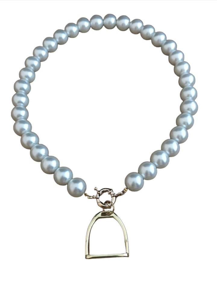 High Quality Glass Pearl Necklace with a large gold stirrup pendant