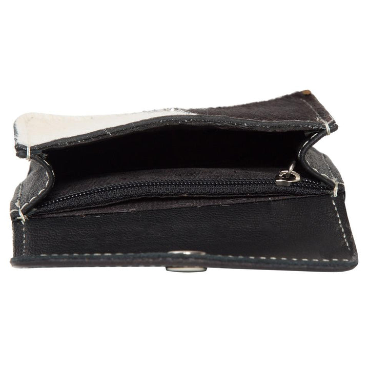 This super handy cowhide card purse with intricate hand tooled details on the flap is perfect for keeping your bag light by holding a few cards and coins. The hand tooled flap with snap button closure makes this cowhide purse ideal for night out or for a grocery run.