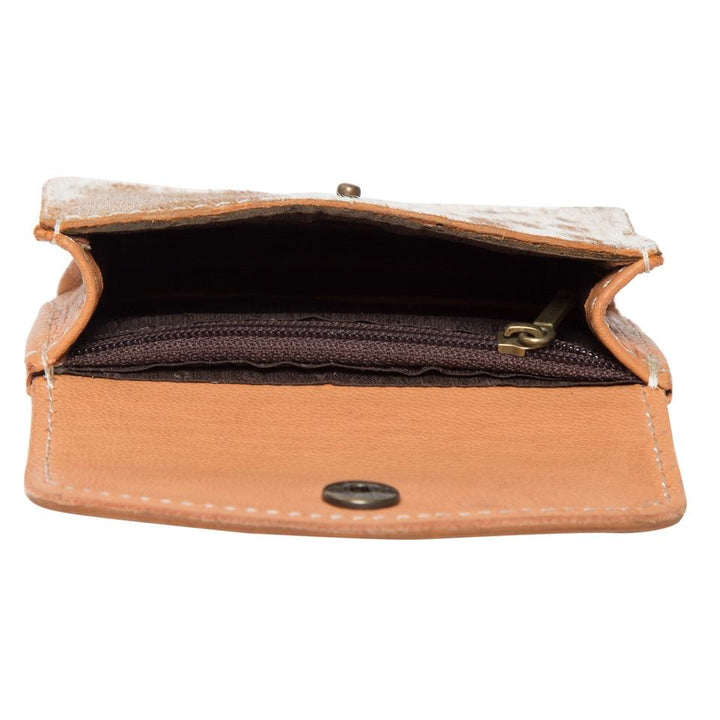 This super handy cowhide card purse with intricate hand tooled details on the flap is perfect for keeping your bag light by holding a few cards and coins. The hand tooled flap with snap button closure makes this cowhide purse ideal for night out or for a grocery run.