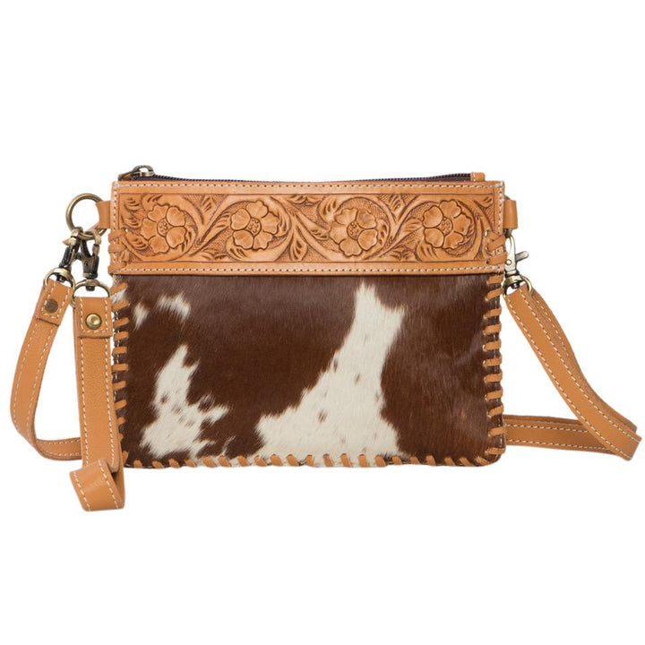 This breathtaking small cowhide clutch bag with hand tooled details is a perfect day-to-night option. This sleek style features enough room for use as an evening cowhide clutch or a day cowhide sling Bag. This beauty finished off with stunning hand tooled details, includes detachable and adjustable genuine leather shoulder strap plus detachable wrist strap.