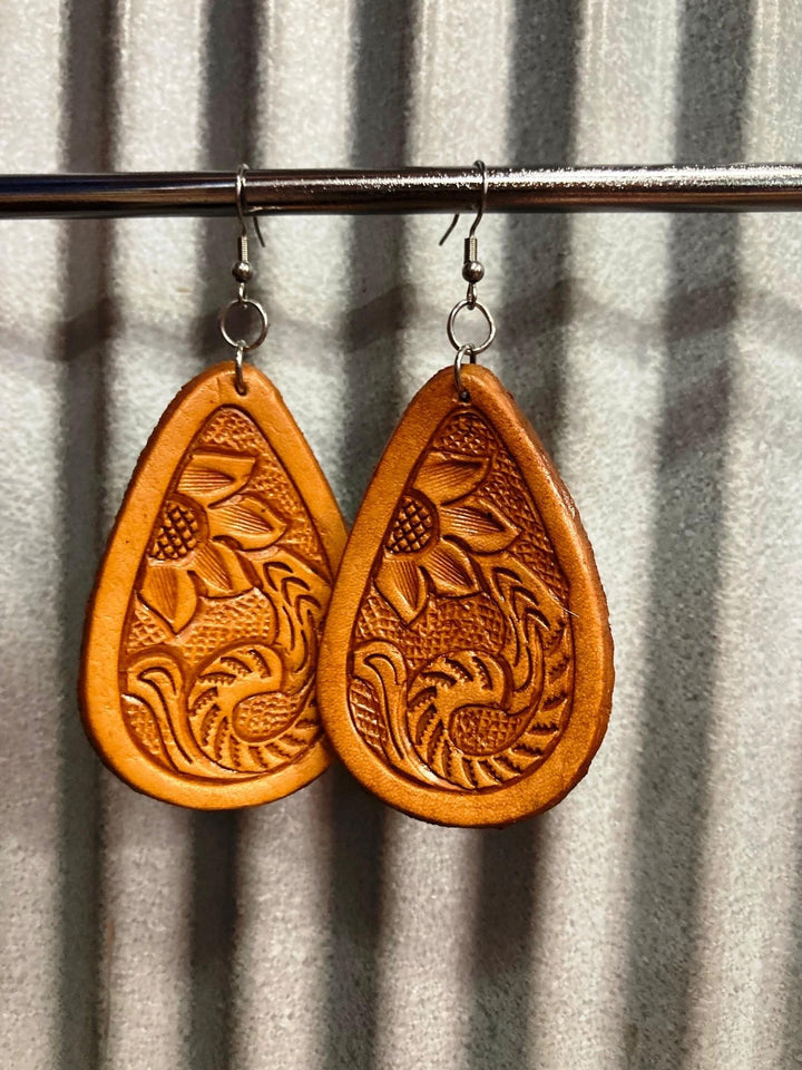 The Design Edge - TooledLeather Pear Drop Earrings - Tan