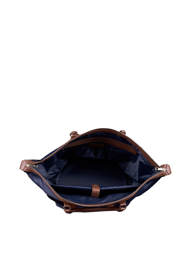Top zip closure, contrast trim and carry handles, internal zip pocket, internal padded laptop sleeve, logo metal badge, fully lined.