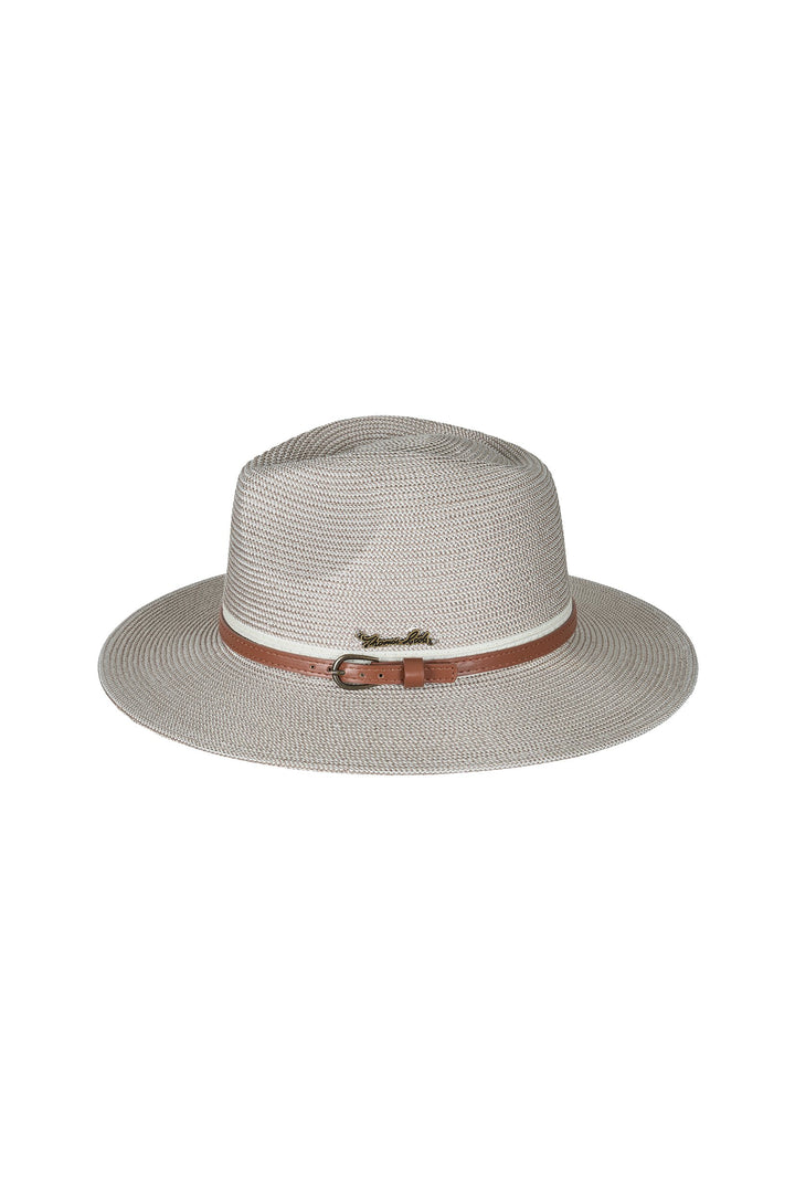 Contrast hat band with metal buckle, adjustable sweatband, Thomas Cook metal logo pin.
