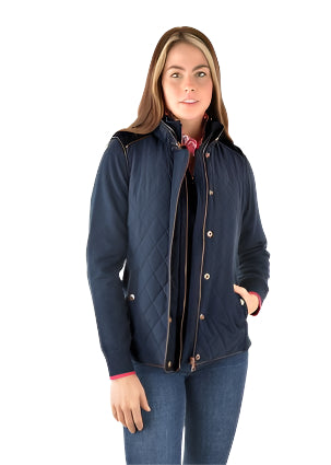 Water resistant fabric, diamond quilted, mock leather piped trim, rib inner collar and side panels for stretch and comfort, jersey lining, TC internal trims and pockets, premium zipper opening, welt pockets, horseman embroidery on chest