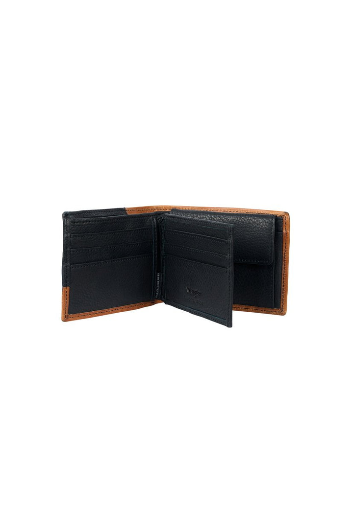Bifold closure, basketweave emboss, contrast tab, 6 x card slots and 1 x ID slot, 2 x note pockets, coin pocket with snap closure, 1 x zip pocket, Wrangler® iconic logo concho, RFID PROTECT technology protects your credit cards from fraud and identity theft.